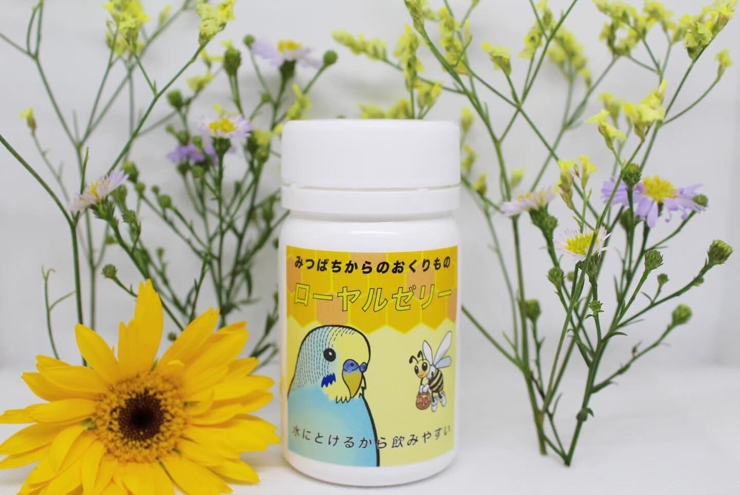 漫画家の花沢りん吉さんに、ローヤルゼリーが大好きだったご長寿セキセイインコのピーチを描いていただきました。(ラベルの絵が違いますが中身は同じです。)