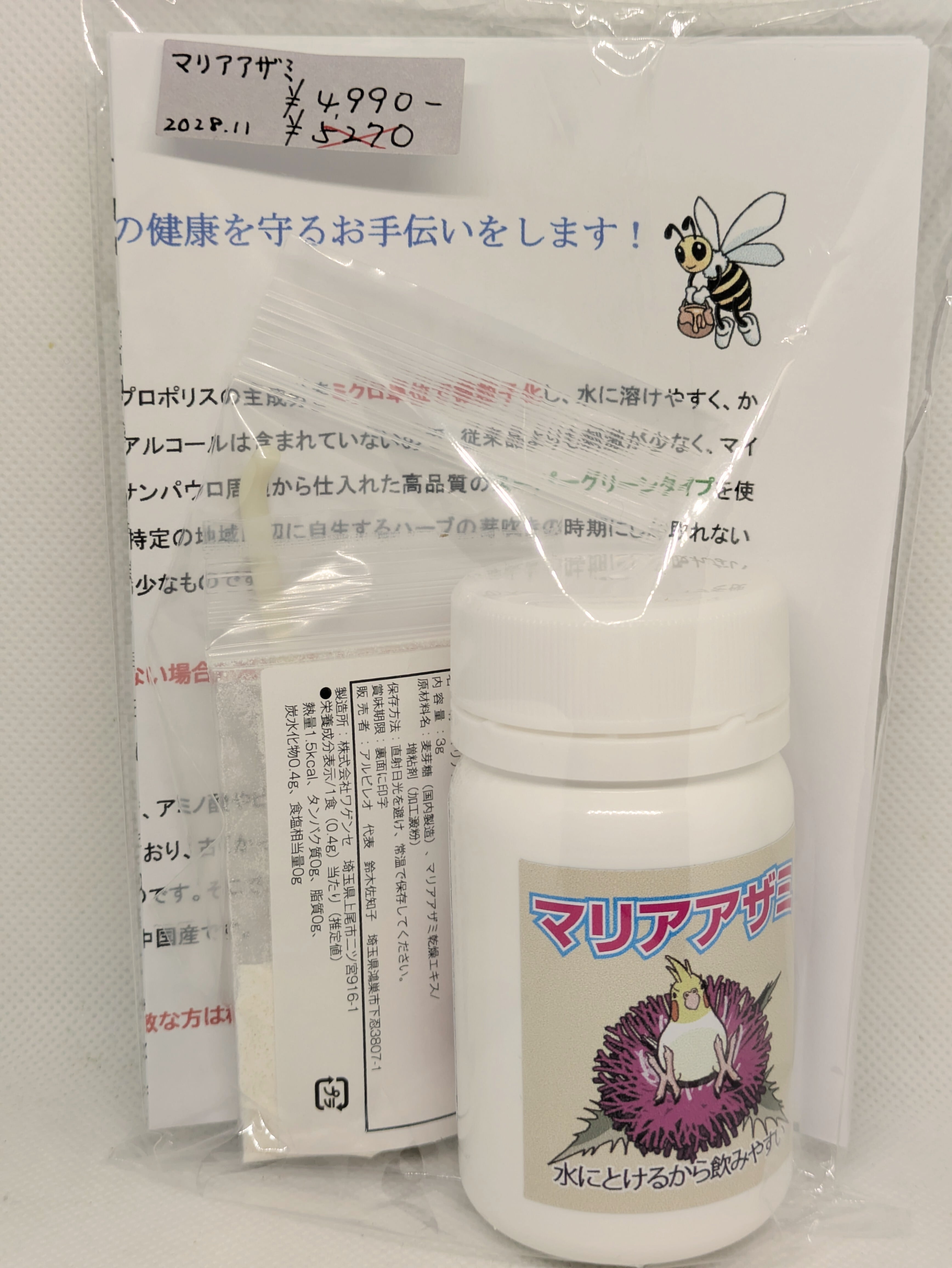 マリアアザミはヨーロッパで古くから使われてきたハーブで、別名「ミルクシスル」または、その成分から「シリマリン」とも呼ばれています。特有のフラボノイド類を含みますが、プロポリス同様、そのままでは水に溶けず、消化吸収されにくいという特性もあります。そこでアルビレオではプロポリスの加工技術を活かした製品づくりに着手しました。原料はスペイン産です。飲み物やヨーグルトなどに混ぜてお召し上がりください。