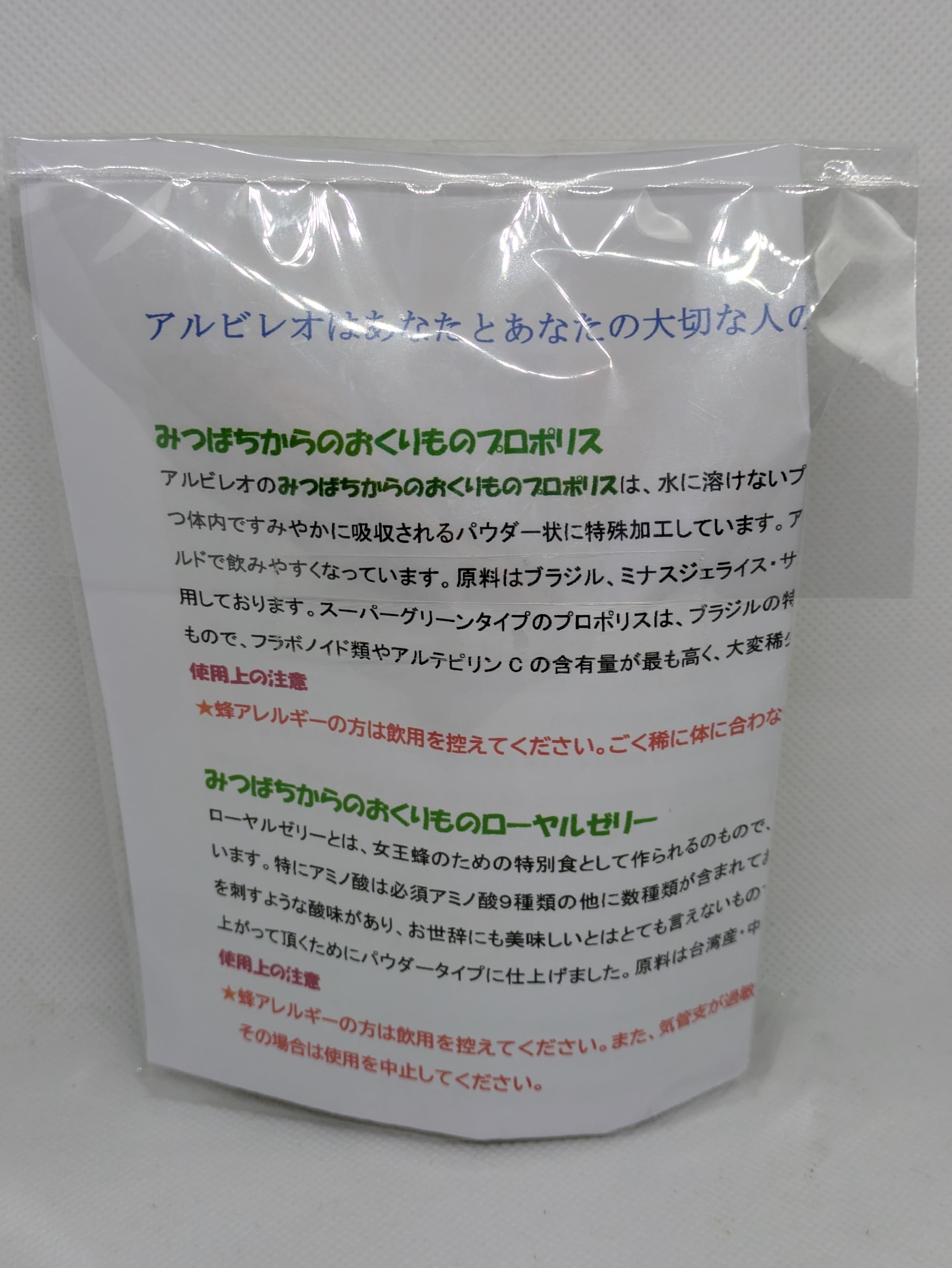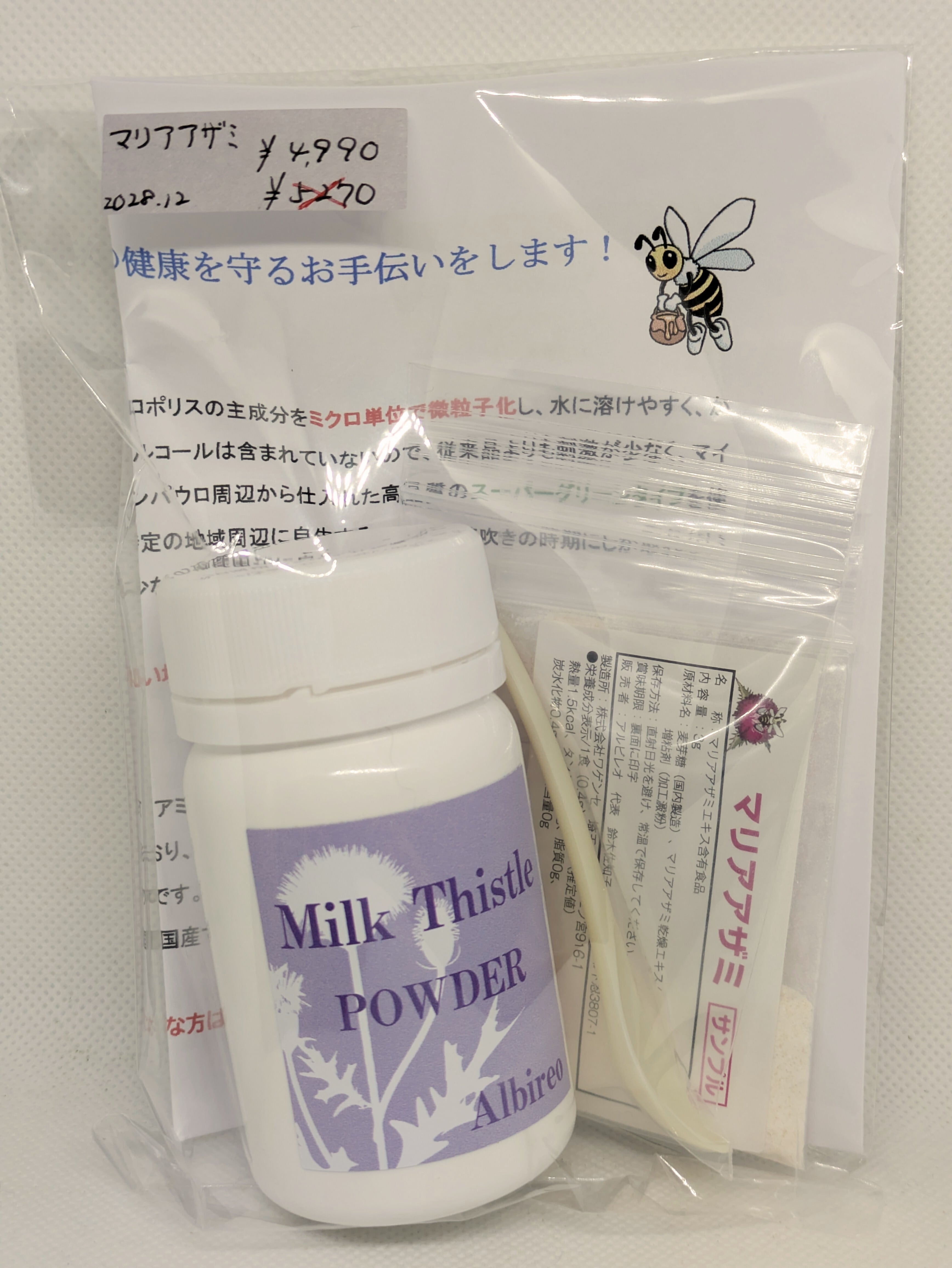 マリアアザミはヨーロッパで古くから使われてきたハーブで、別名「ミルクシスル」または、その成分から「シリマリン」とも呼ばれています。特有のフラボノイド類を含みますが、プロポリス同様、そのままでは水に溶けず、消化吸収されにくいという特性もあります。そこでアルビレオではプロポリスの加工技術を活かした製品づくりに着手しました。原料はスペイン産です。飲み物やヨーグルトなどに混ぜてお召し上がりください。